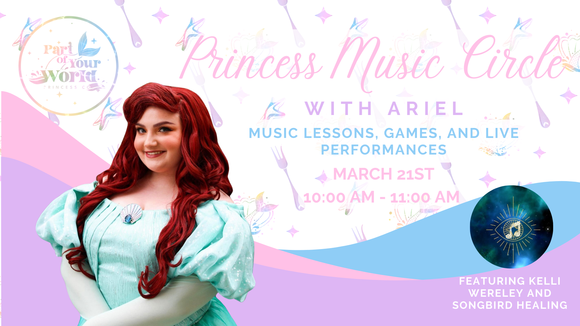 Join us for a magical morning of music, rhythm, and dance, featuring Kelli W. of Songbird Healing! Each child will learn a song inspired by the music of The Little Mermaid, followed by a visit and performance from Ariel herself!